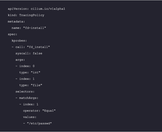 To illustrate how to use Tetragon for runtime security monitoring, let’s use the example below. We’ll be examining a kprobe that’s attached to the fd_install kernel function.