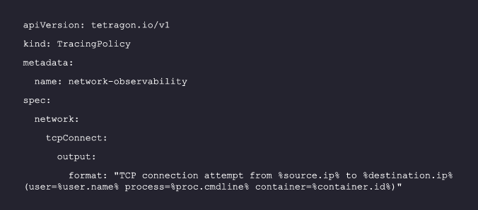 The following code illustrates a tracing policy that monitors TCP connection attempts. When a TCP connection attempt is detected, it outputs a formatted message with details about the source, destination, user, process, and container: