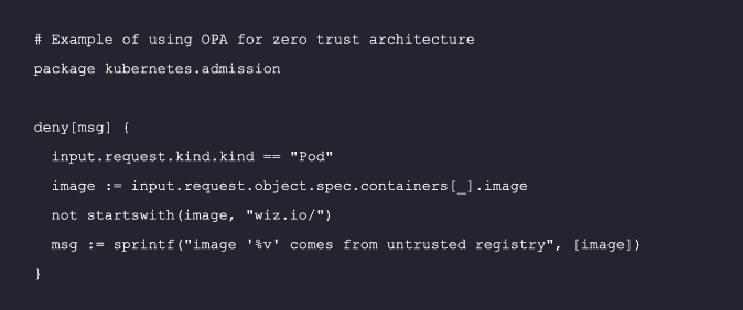 The “zero trust” principle dictates that no entity, internal or external, should be trusted by default. For example, even an internal service request should be thoroughly verified before access is granted. Implementing a zero-trust architecture in your container environment with open-source tools like OPA (Open Policy Agent) ensures that every request is verified, reducing the risk of breaches: