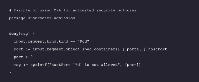 Manual security practices are prone to human error and can’t keep pace with containers’ dynamic nature. For example, a developer might accidentally expose a sensitive port due to a configuration error. Automated security policies, implemented with open-source tools like Open Policy Agent (OPA), can enforce security measures consistently and efficiently across your entire container environment, preventing such errors: