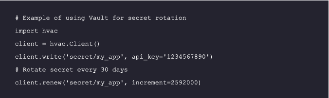 Automated systems for secret rotation, like the open-source tool Vault by HashiCorp, can ensure that even if a secret is compromised, it won’t be valid for long. For instance, the following code will rotate secrets every 30 days :