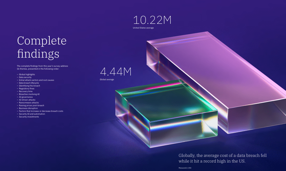 - $4.44 million – The global average cost of a data breach, down 9% from 2024.